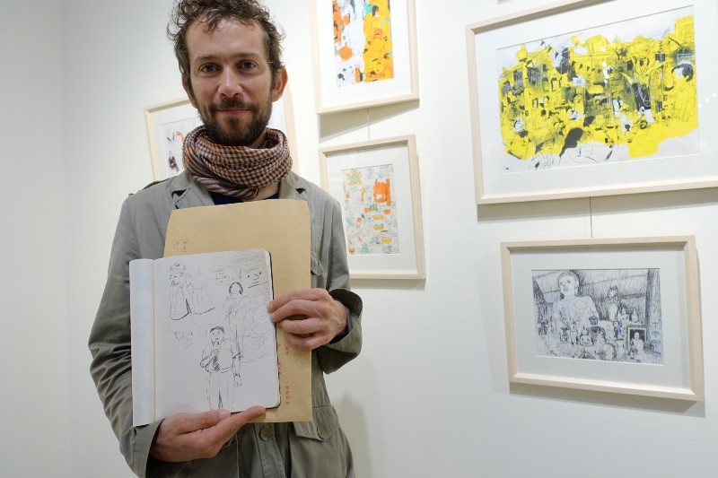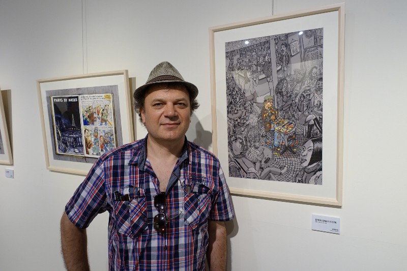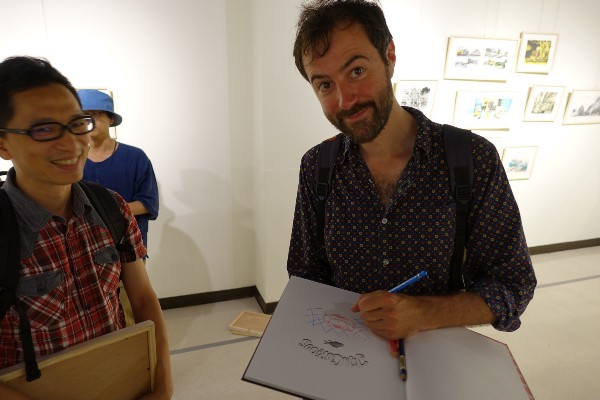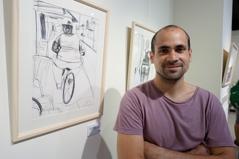 法國旅行圖文作家揚‧凱必展出繪本《法國狗狗遊紐約》之外,也展出在舊金山到紐約旅行的三個月期間為了挑戰自己繪製的連續創作。他喜歡畫畫,也喜歡練拳擊,挑戰自己,「如果總是畫一樣的作品,會很無趣。那時因為時間有限,有些作品又很大,線條會比較隨性,不拘泥在細節上,比較能刺激出不同型態的作品。」