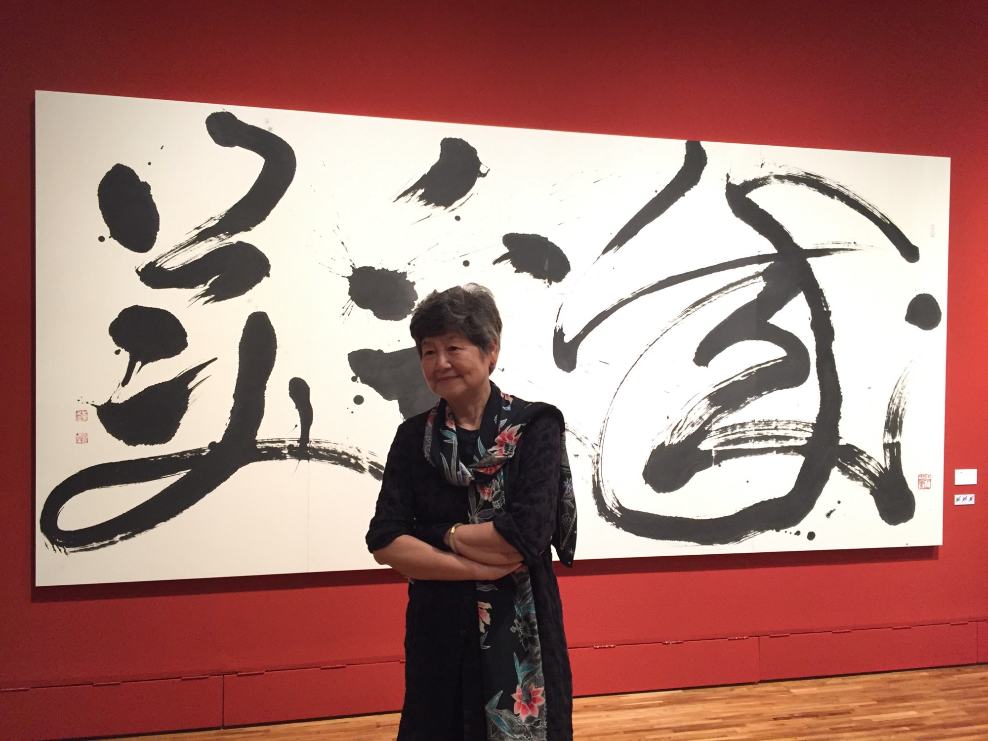 董陽孜這次展出的是2014年到2015年間的作品。其中《和為貴》和《成人之美》兩幅創作,選用紅色作為背後展示牆的底色,特別顯眼,「孔子是很熱情的人,所以我選用紅色。」董陽孜解釋,現在社會衝突不斷,希望大家能展現「成人之美」、「以和為貴」的態度。